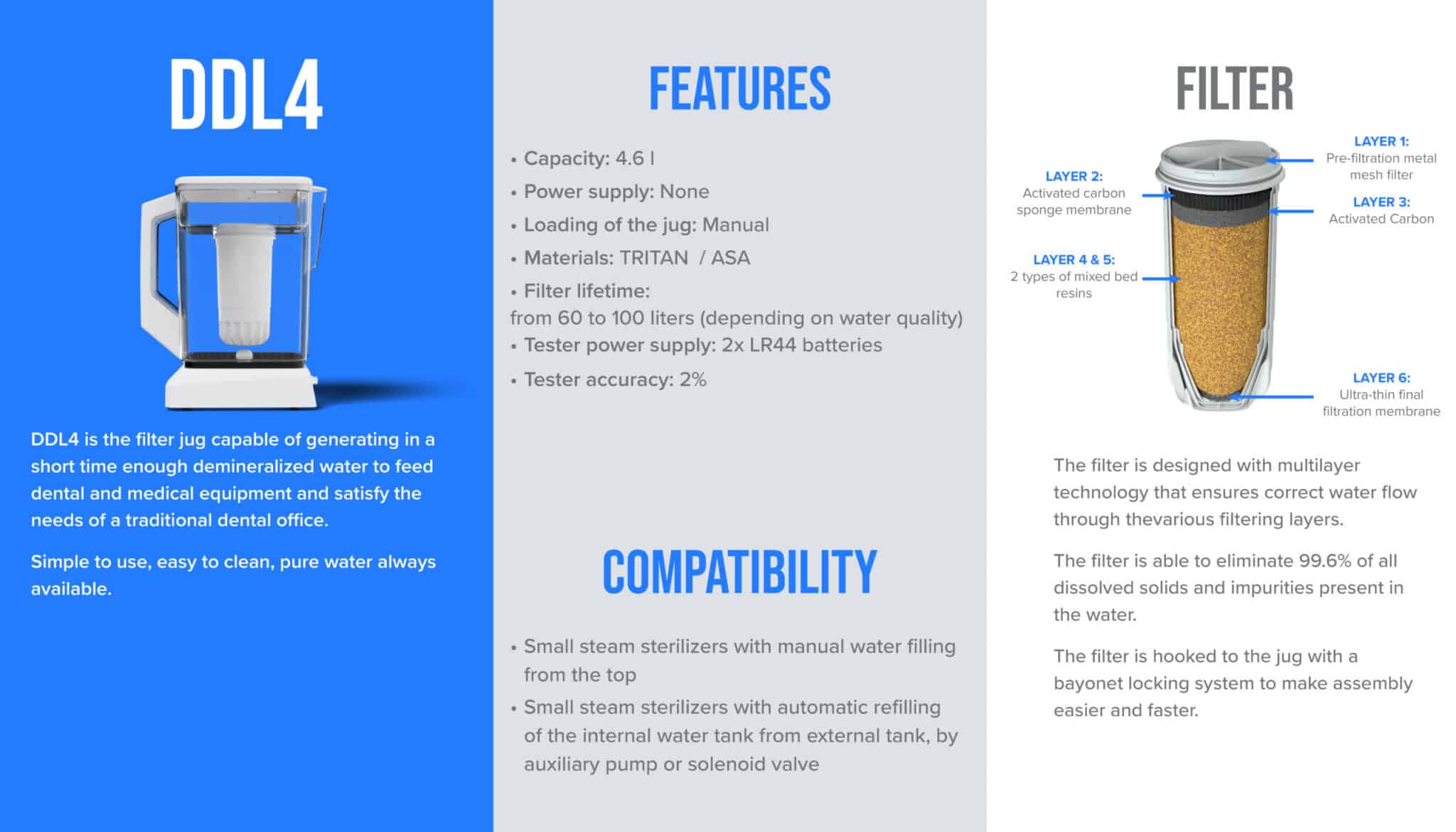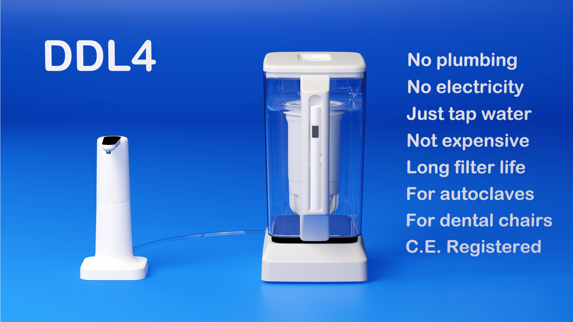 The DDL Super Jug produces de ionised water for autoclaves and dental units within 20-25 minutes.